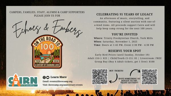 Join us as we celebrate 95 years of Cairn's legacy at Echoes & Embers on Saturday, November 1 at Trinity Presbyterian Church, York Mills. Cairn, a Presbyterian summer camp in Muskoka, has been a place where children and youth experience God’s love through community, creativity, and the outdoors. This special afternoon will feature music, storytelling, and a silent auction in support of Cairn—helping to continue to nurture connection, growth, and belonging for the next 100 years.
